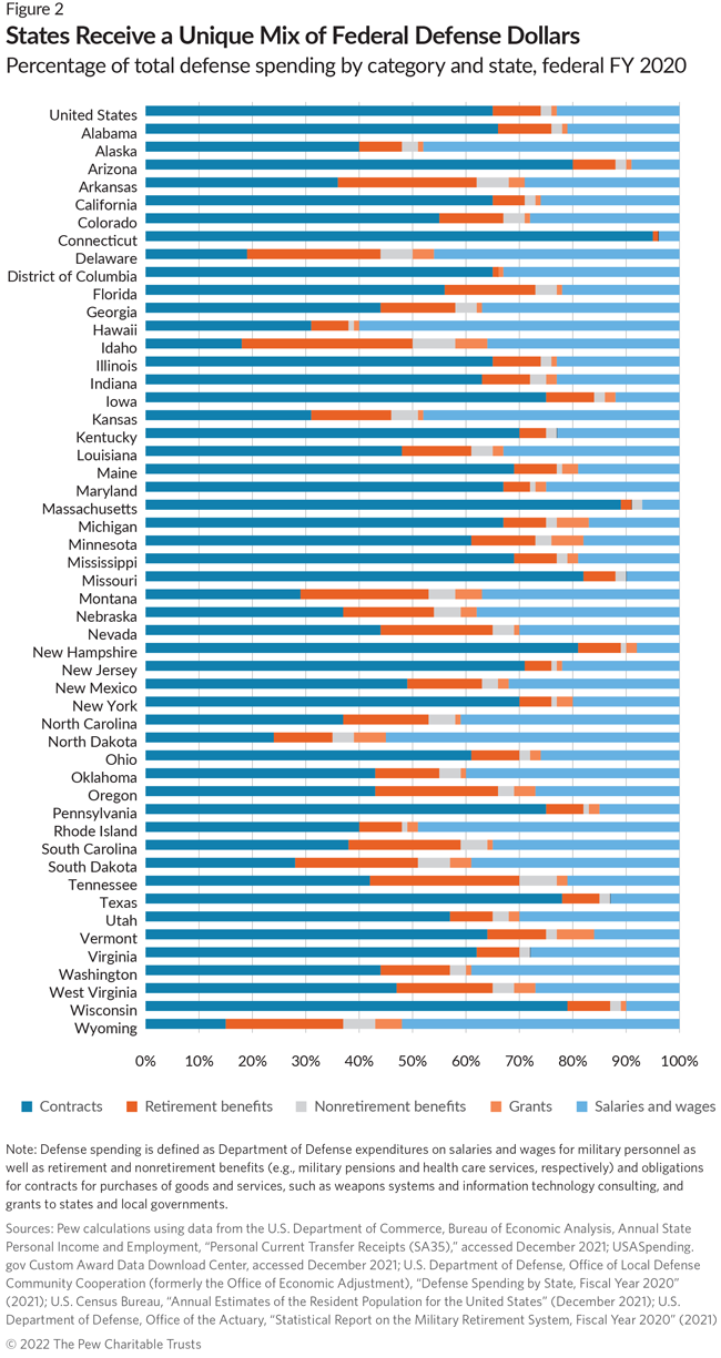 Defense spending falls into five major categories: contracts, salaries and wages, retirement benefits, nonretirement benefits, and grants (see below for more information on each). Because each state’s level and mix of defense spending is unique, the effect of federal budget changes varies by state.