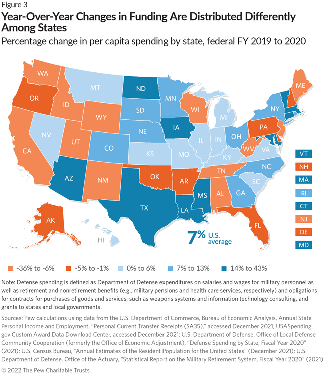 Policy decisions around how defense dollars are spent resulted in variations in the increases and decreases that states saw by spending category: