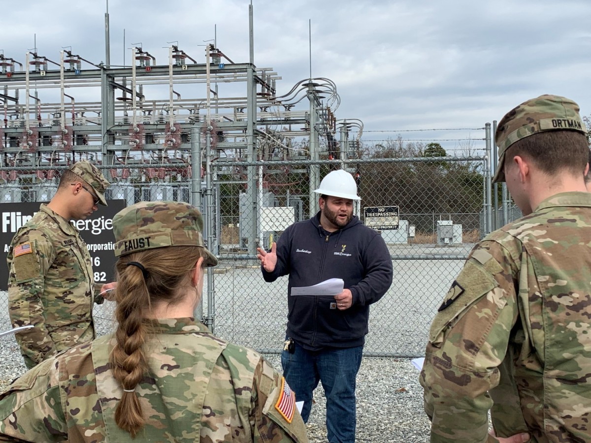 The cadets began by meeting with the Fort Benning garrison commander, Col. Alexis Rivera Espada, and his deputy Brandon Cockrell, to learn about big picture management aspects of institutional change and infrastructure development and how they impact long term projects. The cadets' guide for the day Whitney Ray, Fort Benning's Energy Manager, provided them an initial overview of the vastness of Fort Benning’s energy infrastructure and key points of its resilient design.